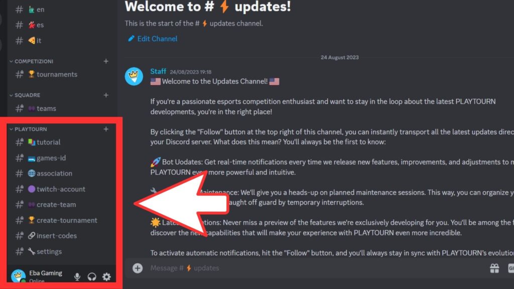 As soon as the Bot joins your server, it sends you a private message. It asks you to choose the Bot’s language. After making the selection and pressing confirm, the bot automatically creates the PLAYTOURN category with all the necessary channels to manage it. You can move the channels wherever you prefer or keep them in the same category.